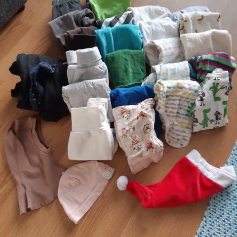 Paketissa jouluisia bodyja 3 kpl, jouluiset housut 1 kpl, tonttulakki ja tontun asu (primark)