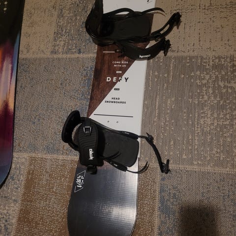 Head Defy JR lumilauta, pituus 128 cm. Laudassa on musta, valkoinen ja ruskea väritys. Mukana Head S-koon siteet.