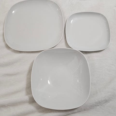 Otsikon ja kuvien mukainen tumma astiasto. Sisältää 6 isoa lautasta (26cm), 6 leipälatautasta (20cm), 6 syvää lautasta (20cm) ja 6 hengen aterin setin (haarukat, veitset, teelusikat ja isot lusikat)