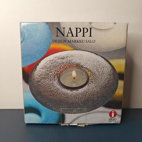 Iittala Nappi kynttilänjalka, halkaisija 125 mm, väri punainen. Käytetty ehkä osti kertaa, muuten säilytetty laatikossaan.