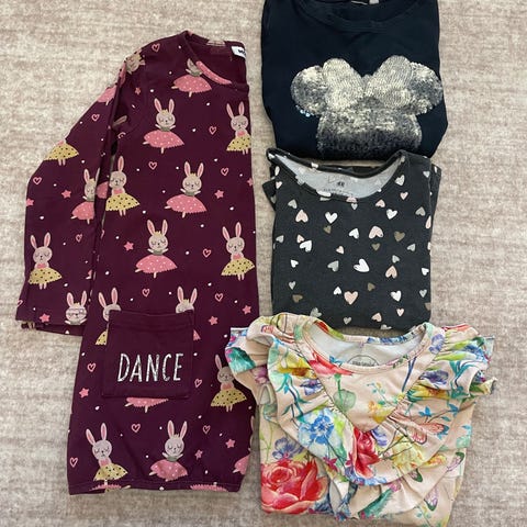 Myydään trikoopaidat, jotka mielestäni vastaavat kaikki kokoa 116cm (olleet tässä koossa meillä käytössä), 2€/kpl tai pakettina 5€.