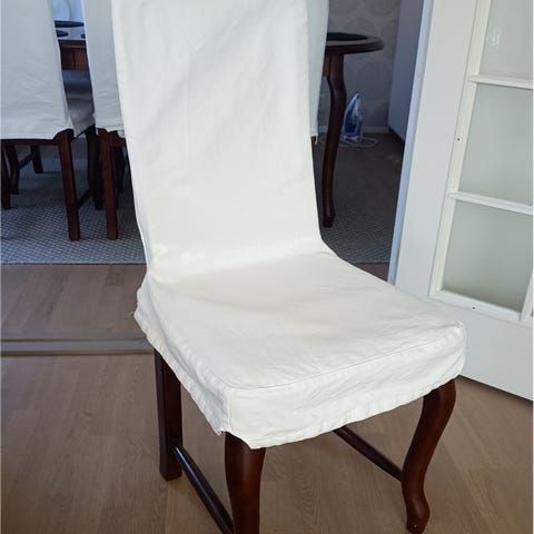 Neljä kappaletta ruokapöydän tuoleja. Harmaat pehmusteet ja valkoiset puuosat. Istuimen korkeus 44cm. Ostettu Sotkasta vuonna 2016, malli oli Zarah. Kaksi tuoleista hyväkuntoisia, kaksi vaatii kunnostusta. Muutamalla ruuvilla onnistunee.