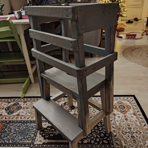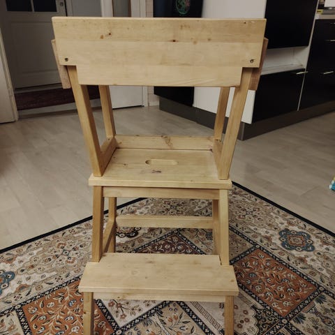 Suomen voimistelutuotteen valmistama Pikkuapulainen, lasten keittiöjakkara.(ovh 199e) Valkoinen siistikuntoinen tukeva jakkara keittiöön, jolla pienikin lapsi voi osallistua kokkaamiseen ja leipomiseen turvallisesti. Tuolissa on kaksi askelmaa ja kaiteet molemmilla sivuilla lapsen turvallisuuden takaamiseksi. Ylätaso säädettävissä kahteen eri korkeuteen. Yleisilme siisti. Soveltuu lasten käyttöön esimerkiksi keittiössä tai muissa kodin tiloissa. Mmm. Eläinkoti.