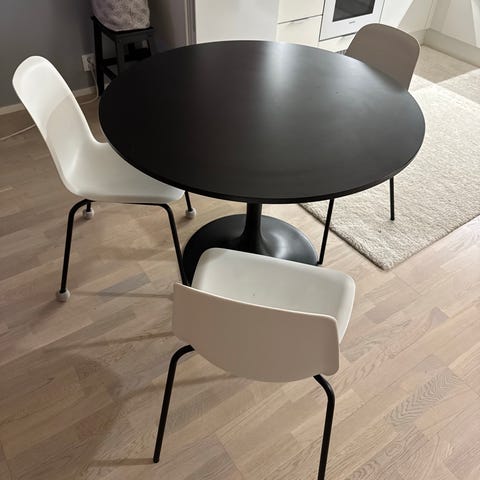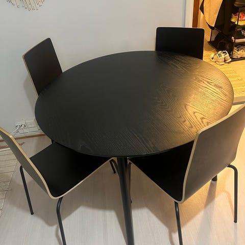 IKEA pöytä ja kaksi puista tuolia. Pöytä on koottu ja sopii keittiö- tai ruokailutilaan. ÅLHULT-pöydän saarniviilupinta on sävytetty kirkkaalla lakalla, joka suojaa puun luonnollista kauneutta ja helpottaa pöydän ylläpitoa.