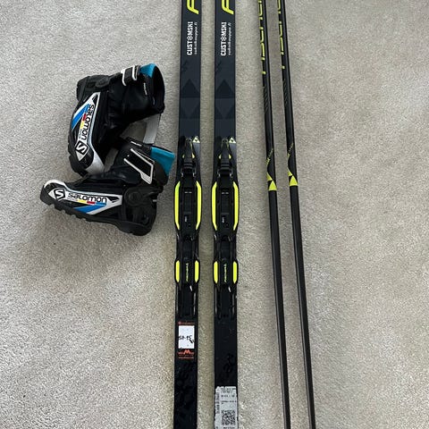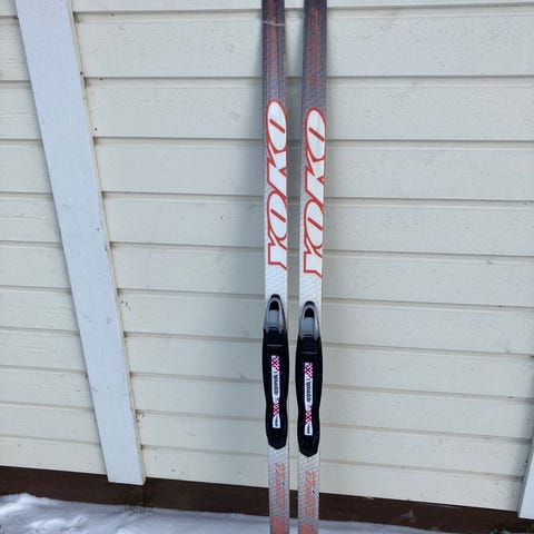 Suksilla hiihdetty noin 5 kertaa. Toisen suksen perässä pieni lohkeama, joka näkyy kuvassa. Muuten pohja virheetön ja naarmuton.
