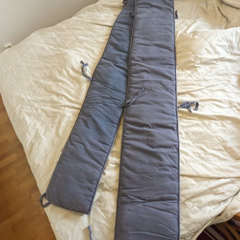 Pinnasängyn reunapehmuste sininen letti, jossa päissä tarrakiinnitys. Pituus 210 cm. Hyvässä kunnossa ja pesty hajusteettomalla pesuaineella. Eläimetön talous. Nouto Helsingin Jätkäsaaresta, käteinen tai mobile pay.