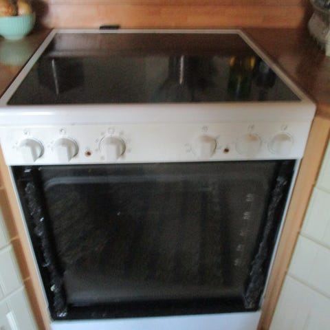 Kunnossa oleva keraaminen liesi. 60 cm. Uunin luukun etulasi vaatii uudelleen kiinnitystä. Ei kuljeteta, haettava itse.