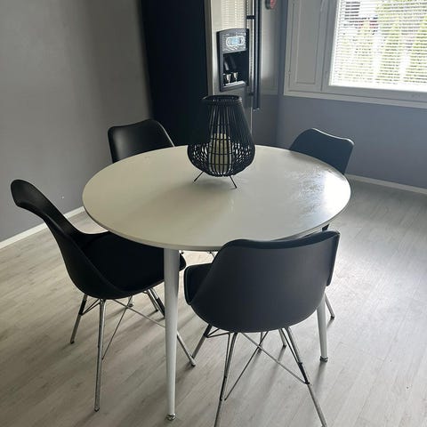 Pyöreä valkoinen pöytä ja 4 tuolia