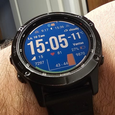 Garmin Fenix 6 X pro solar rannekello, harmaa väri, teräksinen ranneke. Soveltuu monipuoliseen käyttöön urheilussa ja arjessa. Latautuu myös auringon valosta (solar toiminto). Laturi, 2 vaihtoranneketta ja laatikko mukana. Näyttö safiirilasia, eikä yhtään naarmua. Rungon metalli osassa jonkin verran naarmuja. Kello toimii moitteettomasti.