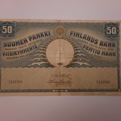 Suomi 50 pennisiä, 1 markkasia, 5 markkanen ja 20 markkanen.