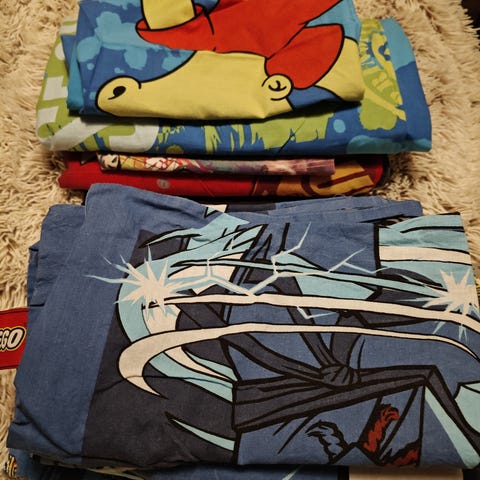Myydään kaksi kpl Lasten pussilakanoita ja tyynyliinoja. Lisäksi mukaan Lasten hupullinen Ninjago pyyhe.