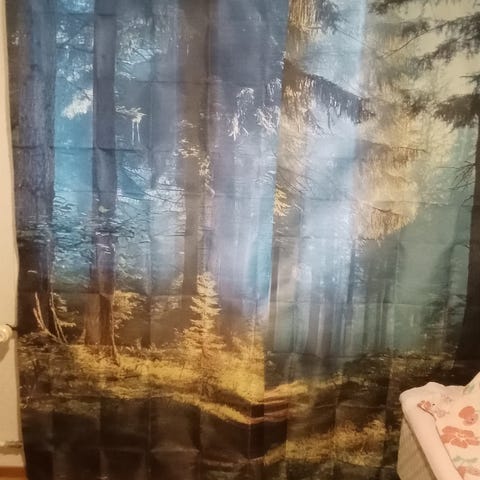 Hyvin peittävät ikkunalla kuusimetsä aiheiset verhot 113x230cm. Materiaali on muovimaista polyesteriä. Kauniit ikkunalla. En ole vielä pessyt näitä. Pehmenee vähän pesussa. Ei tarvi silittää. Nouto, mobilpay, posti, Matkahuolto halvempi lokeroon 6,80e