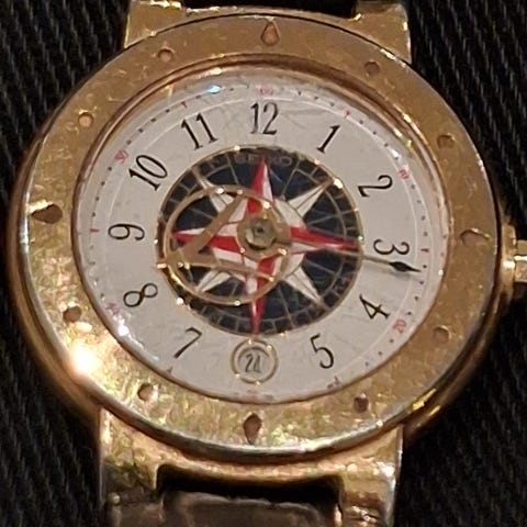 Seiko Type II ref. 4632-8040 Quartz, 50v täyttävä kaunotar vuodelta 1976. Vihreä, marmoria muistuttava kellotaulu, kultaiset ja hopeiset yksityiskohdat. Viikonpäivät sekä ganjina, että englanniksi. Käy todella tarkasti, paristo vaihdettu Marraskuussa, mukaan 1 uusi lisäparisto. Päivyri vaihtaa vain manuaalisesti. Vihreä nahkahihna. Koko n.35mm, lugit 19mm.