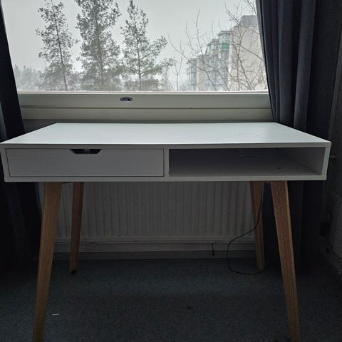 Pöytä on ostettu vuosia sitten Jyskistä (kuin myös tuoli). Pöytä hieman huojuu, mutta ei haittaa käyttöä. Pinnassa myös pieniä kulumia, joista kuvat.