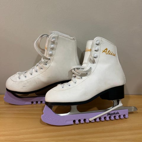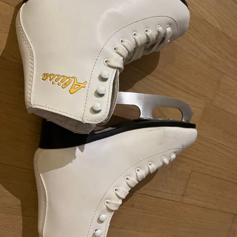 Jemma lasten taitoluistimet koko 35, valkoinen väri. Luistimet on tarkoitettu muun luistelun harrastamiseen. Vähän mustia jälkiä pinnassa, näkyy kuvassa.