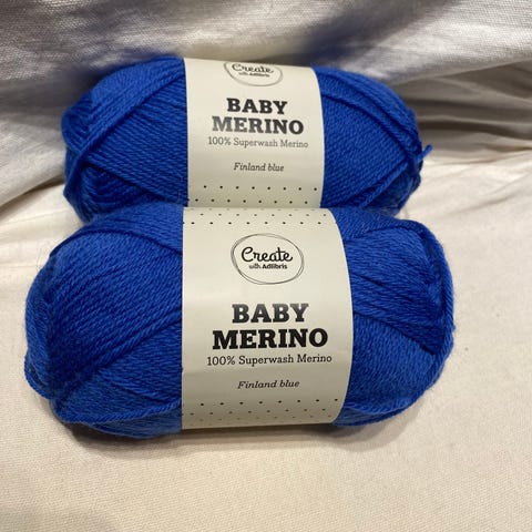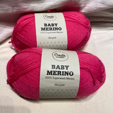 2 kerää Adlibriksen Baby Merino -lankaa. Väri Cristmas red (A019). Molemmat samaa värierää (Y3761).