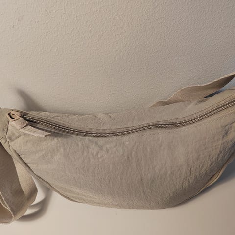Näppärä ja kevyt oranssi "banaani"- olkalaukku. Säädettävä hihna. Mitat 31x16, syvyys 9cm. (kyseessä maksimimitat)