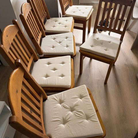 Kruunukalusteen kokopuiset tuolit, jonka kokonaiskorkeus selkänojineen on 96cm. Istuimen pehmusteen materiaali vaihdettavissa helposti.
