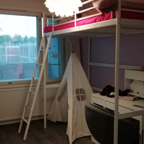Myydään oikein hyvässä kunnossa oleva parvisängyn ja työpöydän yhdistelmä. Todella pätevä lattianeliöitä säästävä ratkaisu esimerkiksi pienemmän koululaisen huoneeseen. Vaikka onkin Ikeaa ja osat kevyen tuntuisia, koottuna kokonaisuus on hyvinkin jämäkkä. Sängyssä patjan leveys 90 cm.
