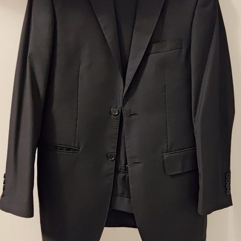 Mustat puvuntakki ja suorathousut. Takin koko on 42 ja housut 44
