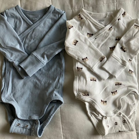 Siistit Lindex kietaisubodyt, 2 kpl. Molemmat bodyt jatkoneppareilla. Värit vaaleanvihreä ja luonnonvalkoinen pöllökuvioilla.