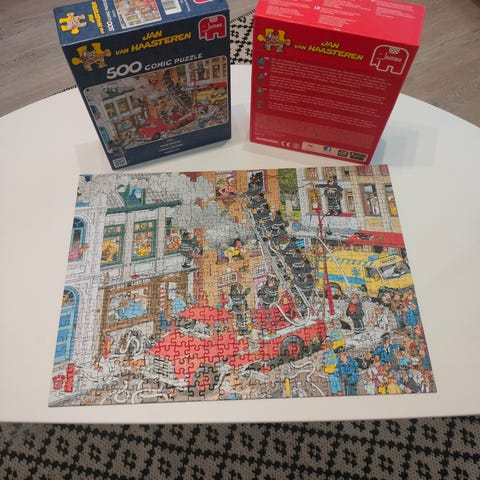 Palapelin kuva-aihe on värikäs, yksityiskohtainen ja siinä seikkailevat tutut hahmot Jan van Haasterenin tunnistettavaan tyyliin.