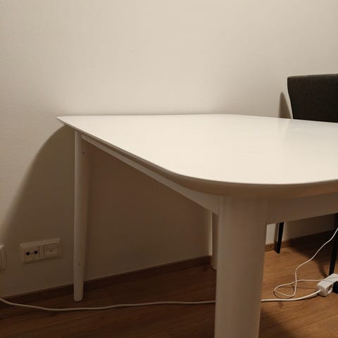 Hyvässä kunnossa oleva pöytäsetti. Huomioitavaa on pöydän tuolleissa. ( näkyy vikassa kuvassa). On mahdollista myös ostaa erikseen.