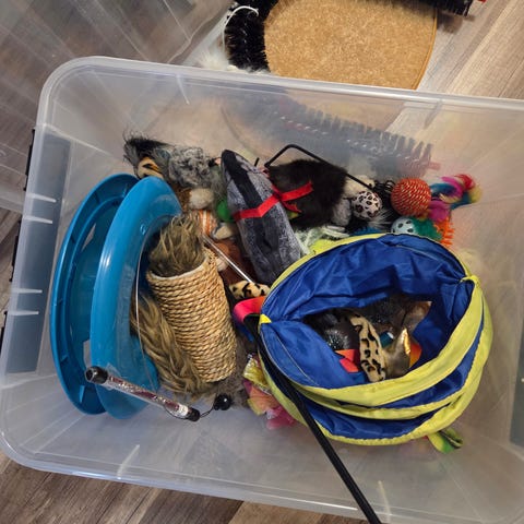 Kasa erilaisia leluja (mm Mad cat-leluja joihin osa kissoista täysin hulluja), tarvikkeita (mm. pillerinantoapuväline) ja ulkoiluun kolme 3m flexiä ja kahdet säädettävät valjaat.