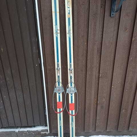 Vanhat puusukset ja sauvat. Sukset 210cm pitkät, 55mm leveät