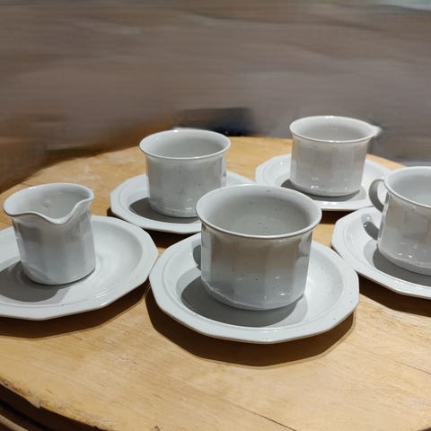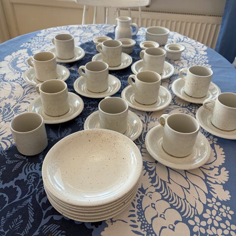 Pentik Saana kahvikupit 8kpl teemukit 8kpl, sokerikko, kermakko, 6isompaa lautasta, 8+12 pullalautasta, 10 aluslautasta.