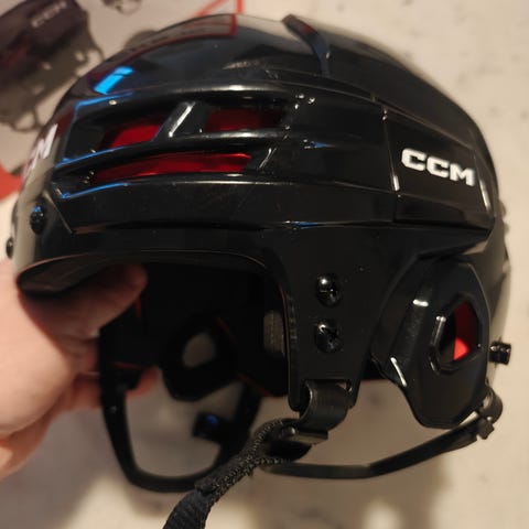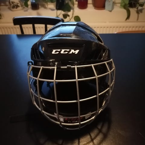 Yhdellä lapsella käytössä ollut jääkiekkokypärä suojuksella. Koko S (48-53 cm).
