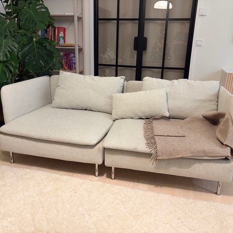 Ikean Söderhamn sohva. Mukaan vaihdettavat päälliset hieman tummemmalla kankaalla. Mukaan myös kiinnitettävä käsinoja. Käsinoja vain kuvan mukaisella tummemmalla kankaalla. Vaaleampi kangas on ikean 'viarp' kangas.