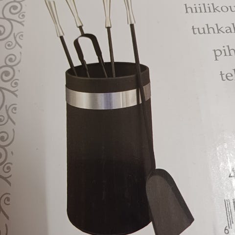 Kolmiosainen musta takkasetti. Sis. lapio, harja ja hiilihanko. Telineen korkeus n. 67cm.