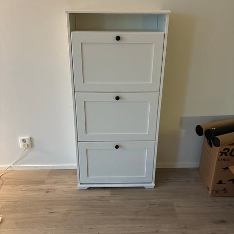 Myydään Ikea Brusali kenkäkaappi, 61x30x130 cm. Ylähyllyllä maali on lähtenyt yhdestä kohtaa (katso kuva), mutta muuten kaappi on erittäin hyvässä kunnossa.