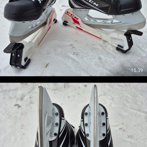 Harvoin luistelukäytössä olleet juniori luistimet koko 34. kenkä ehjä (kantapää,varsi, nauhat, pohjalliset) ei pintanaarmuja. Teräsuojat olleet käytössä, terät ehjät. Mukaan erilliset villapohjalliset.