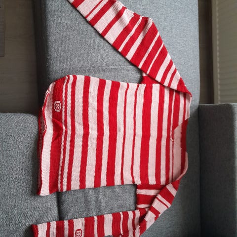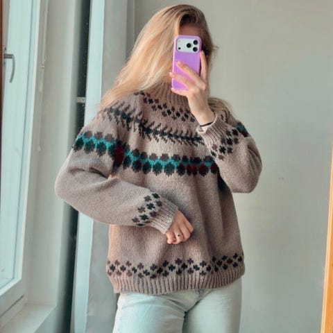 Käsinneulottu tunikamallinen neule. Pyöreä kaula-aukko. Koristeneuletta. 100% puuvilla.