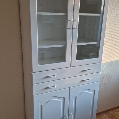 Puinen hyllykkö lasiovilla. Laadukkaan oloinen kunnon puuta oleva kokonaisuus, ei näkyviä lommoja. Menee pariin eri osaan kuljetuksen ajaksi.
