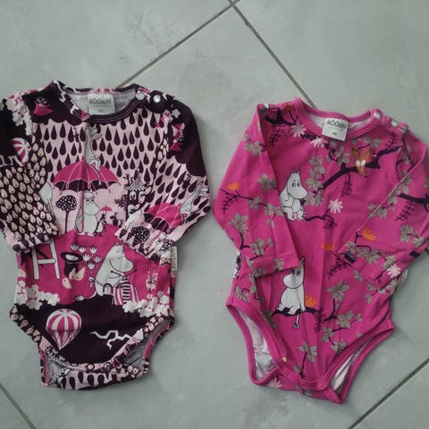 2 kpl muumi bodeja. Toisessa kokomerkintä 68, molemmat vastaa kuitenkin lähemmäs kokoa 62. Siistissä kunnossa, hieman pesunukkaa, yhden vauvan käyttämät.