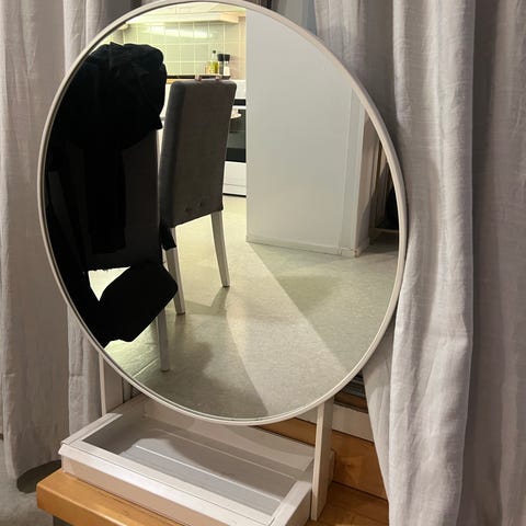 Pyöreä peili valkoisilla kehyksillä, erittäin hyvässä kunnossa. Halkaisija 50cm.
