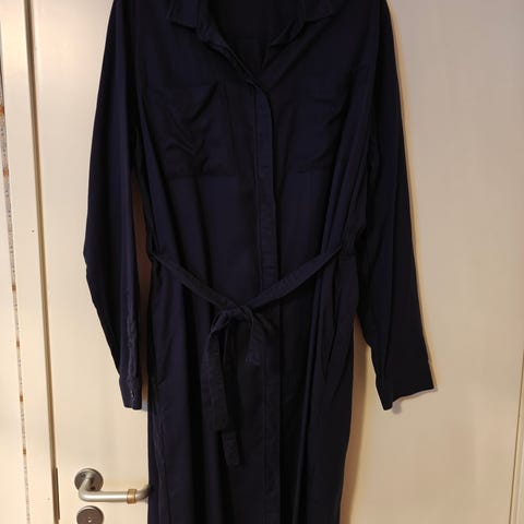 Makia-merkkinen, suoralinjainen, musta paitamekko lyocelliä. Useamman vuoden vanha, mutta käytetty ja pesty max kaksi kertaa eli kuin uusi. Vyölenkit sivuilla ja solmittava vyö mukaan. Paidassa on sekä rinta- että sivutaskut.
