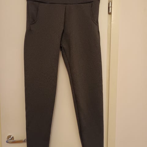 Mustat leggingsit, joiden sivussa koristekivinauha. Koko XL, mutta sanoisin, että reilu XL. Kangas venyy hiukan.