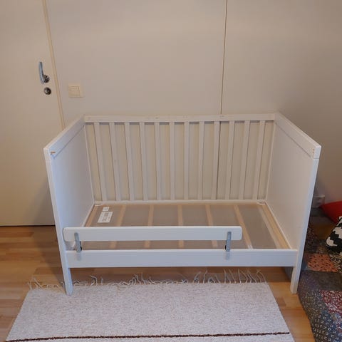 Ikea Gulliver pinnasänky/taaperosänky. Laidan saa pois. Hyvässä kunnossa. Patjan ja lakanoita saa halutessa kaupanpäälle.