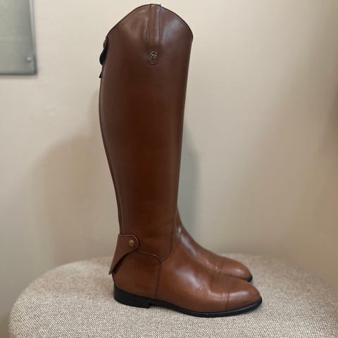 Soubirac (Arena?) ratsastussaappaat. Koko mielestäni pienehkö 41, omaan 40 koon jalkaan hyvät. Varren korkeus takaa lattiasta mitattuna n. 50,5 cm, sisäsivulta 49 cm. Pohkeen ympärys leveimmältä kohtaa 37 cm. Vetoketjut toimii, hyvä kunto. Sisällä saapastuet.