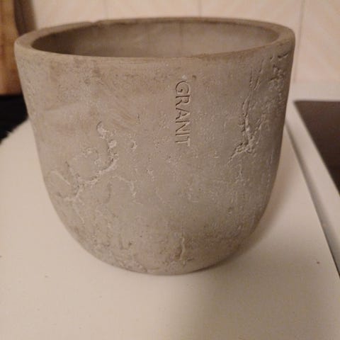 Granitin kukkaruukkuja huonekasveilla x3 ja yksi vähän erilainen. Myös yksi granitin kukkaruukku ilman kasvia. Koko korkeus 14 cm, halkaisija 16 cm. Yhteensä viisi ruukkua, joissa yhdessä ei kasvia.