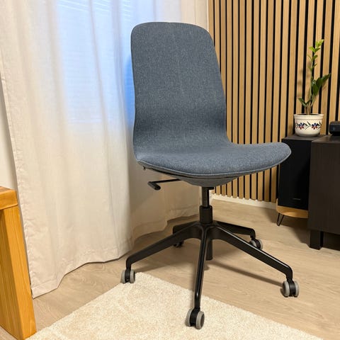 Myyntiin ehjä ja siisti Ikean Långfjäll työtuoli / kokoustuoli harmaan vihreällä kangasverhoilulla ja korkealla selkänojalla. Kallistus- ja korkeussäätömekanismilla, toimii kuten pitääkin. Mahdollisuus ostaa Ikeasta myös käsinojat työtuoliin, kiinnitysreiät löytyy.