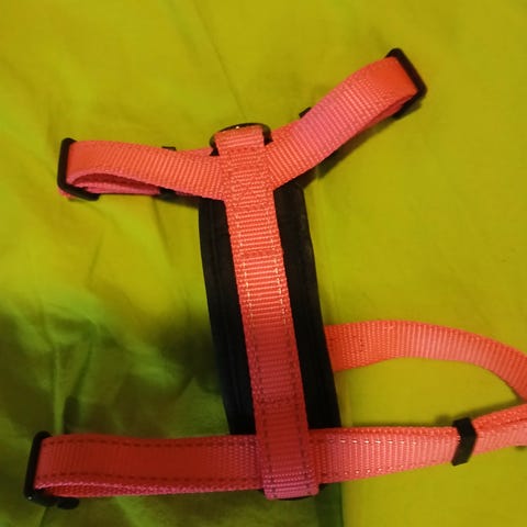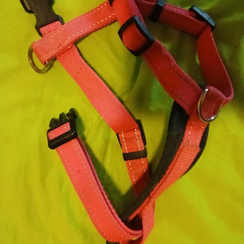 Jonkin verran käytetty eli pientä kulumaa löytyy, mutta muuten oikein hyvät valjaat. Jäivät omalle koiralle pieneksi.
