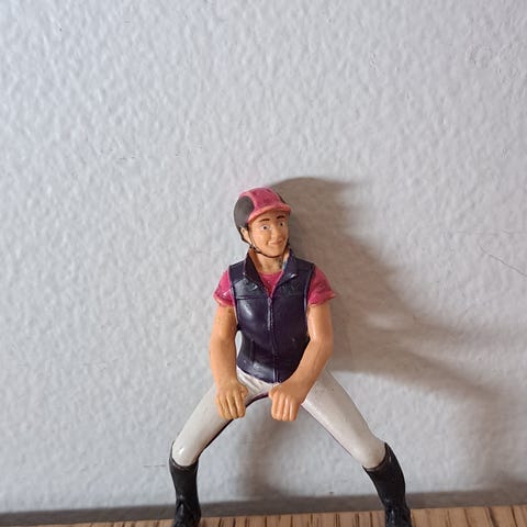 Schleich kouluratsastaja, pientä kulumaa hatussa, käsissä, jaloissa ja takissa (näkyy kuvissa), muuten hyväkuntoinen. Nouto Nokialta tai postitus.