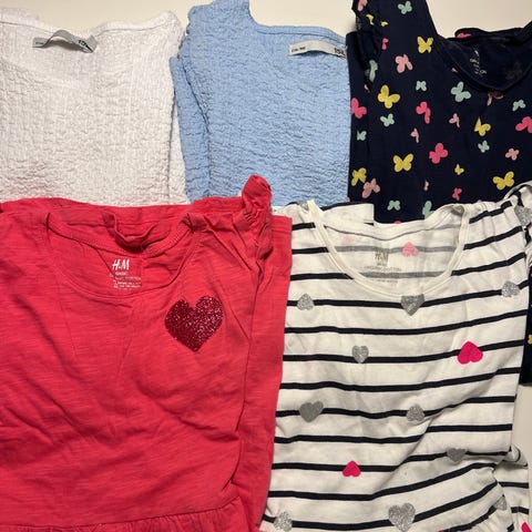 Trikoopaitapaketti koossa 134/140 tytöille. Setti sisältää 6kpl värikkäitä trikoopaitoja.