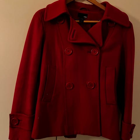 Vain muutamia kertoja käytetty lyhyt tummansininen villakangastakki, jossa yksirivinen nappikiinnitys (toinen nappirivi koristeena) ja syvät taskut. Materiaali 50 % villaa, 40 % polysteria ja 10 % muuta kuitua. Lämmin ja siisti takki pikkupakkasille.