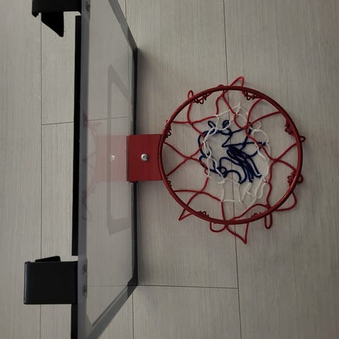 Metallinen koripallokori, jossa punainen kehys ja valkoinen verkko. Soveltuu koripallon pelaamiseen ja harjoitteluun. Seinään kiinnitettävä itse. Verkko ehjä.